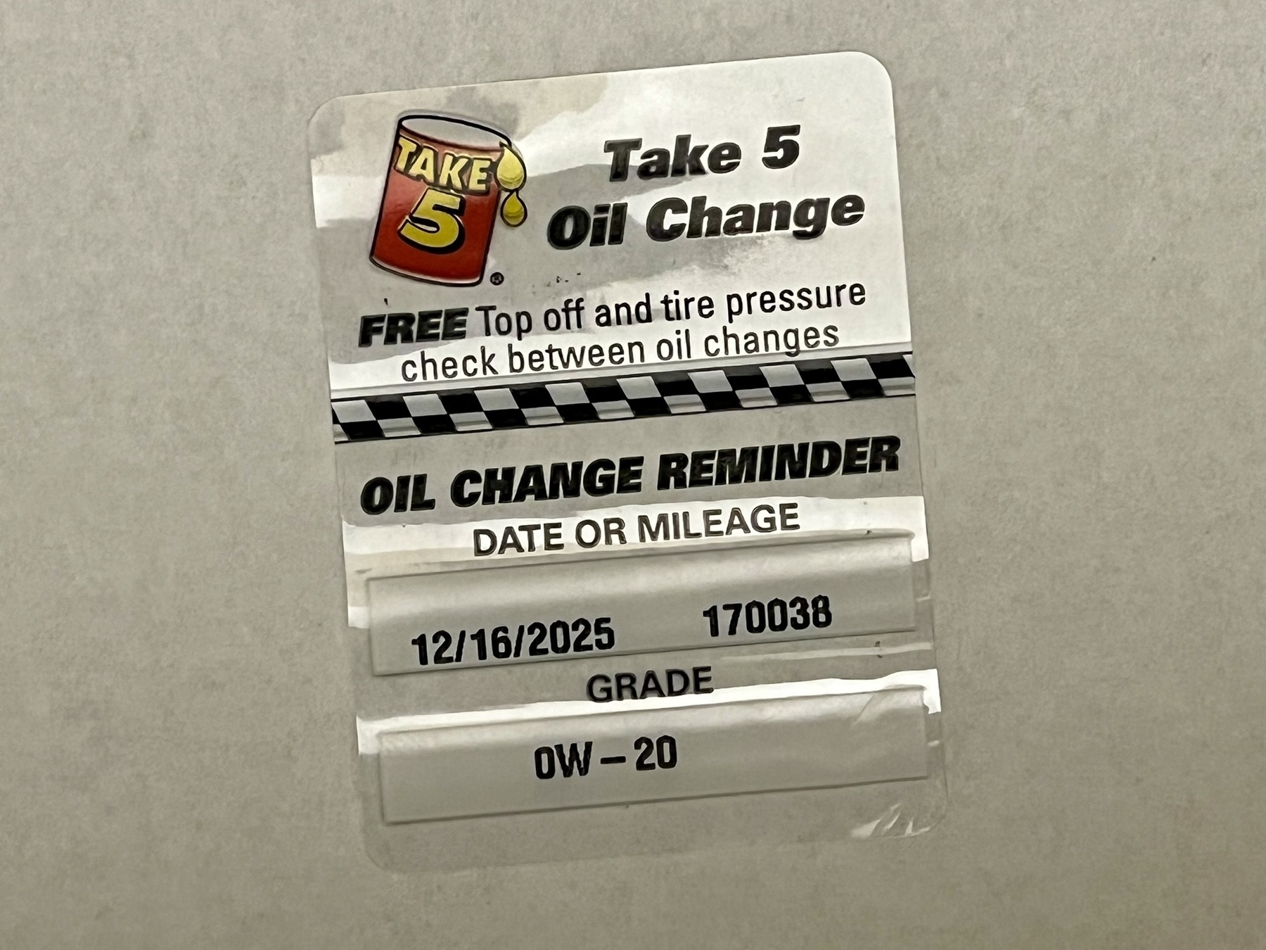 But Take 5 wants to trick you. So they give you this reminder sticker, saying that you can get a free oil ātop offā (huh? that hasnāt really been a thing for decades now, right?) until the date or mileage listed below.