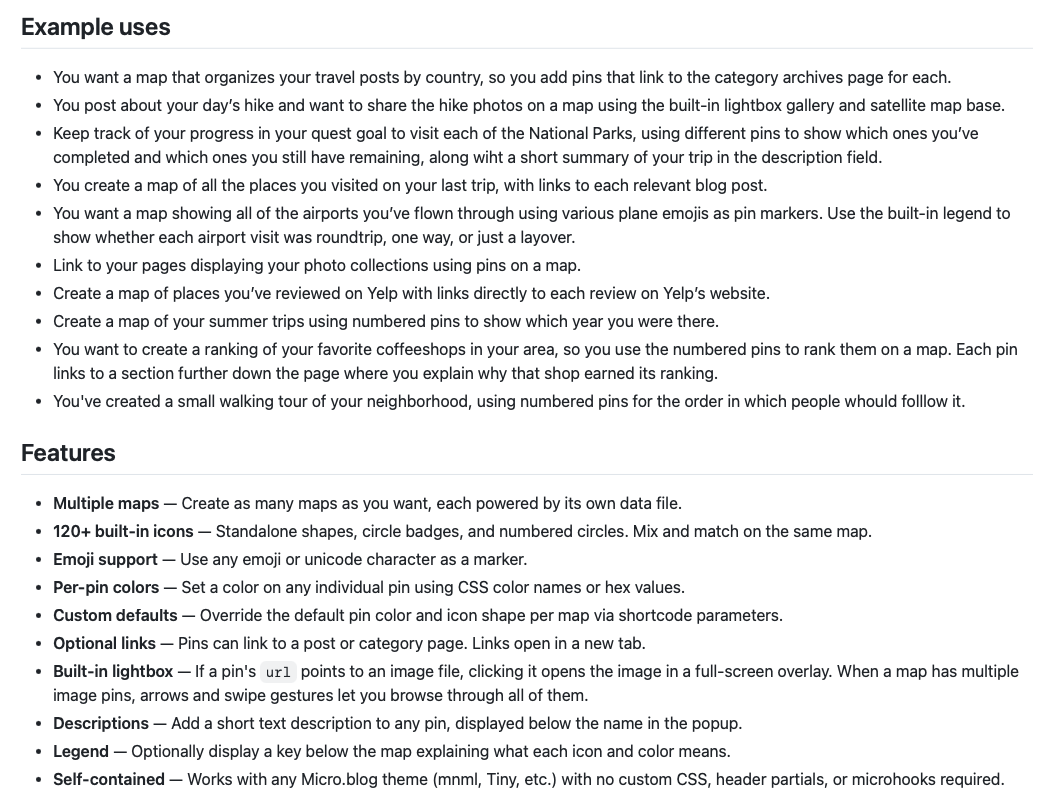 But the more I play with it, the more ways I could see myself using it, well beyond quest progress maps. Finished up a hike? Lemme show all those trail photos on a map. Home from a road trip? Add pins for all the places I went, each linked to its corresponding blog post.