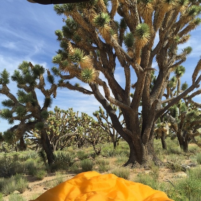 The view this morning from my sleeping bag. #JoshuaTreeForest #GrapevineMesa #SamtheSubie