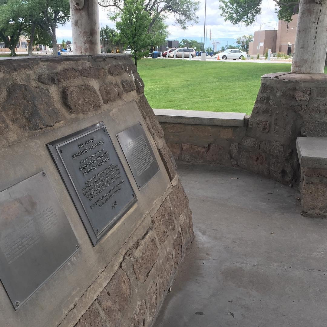 The first atomic weapon was developed in the parking lot in this photo, and loaded for delivery at the site of this memorial.
