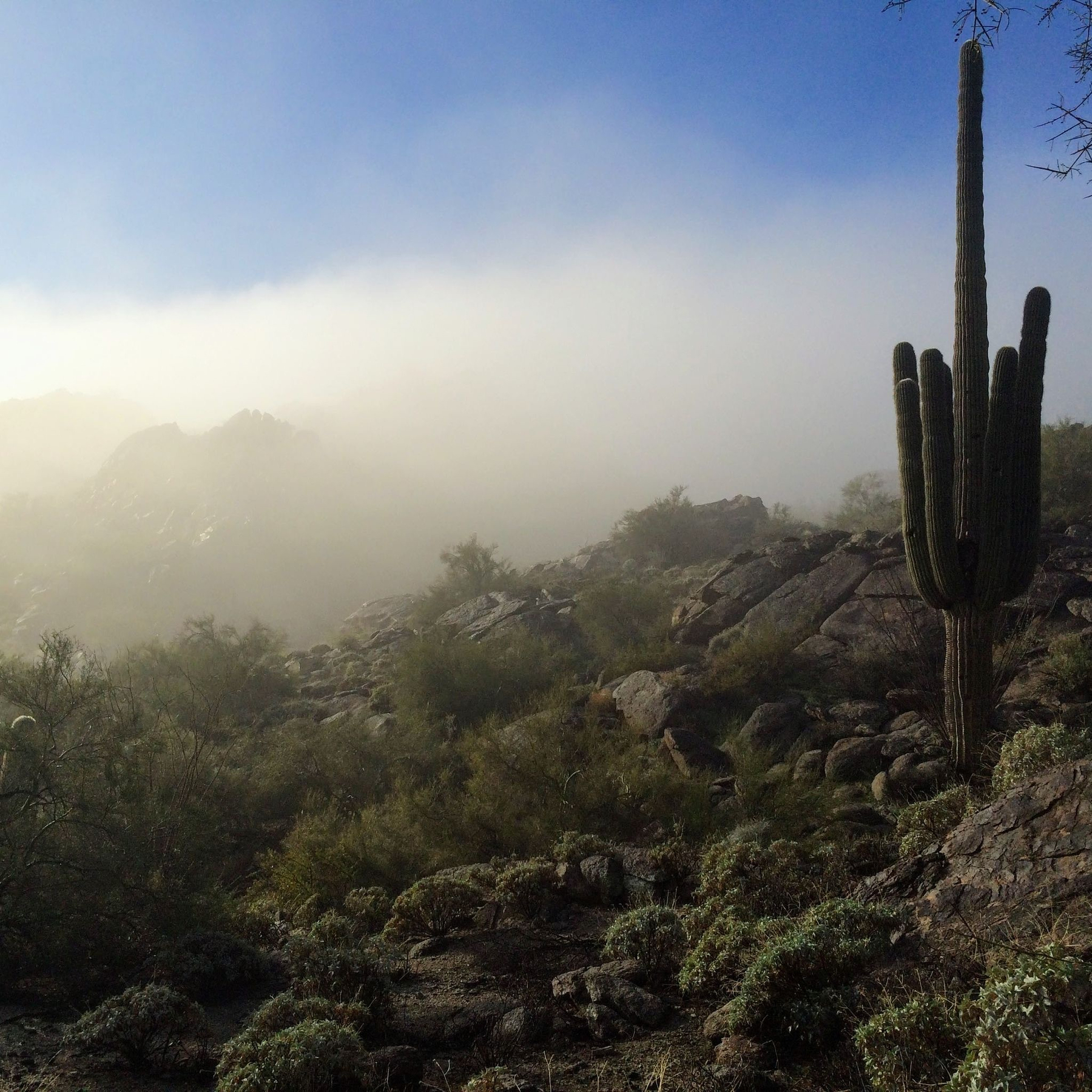 An unusually foggy desert scene in South Mountain Park.
