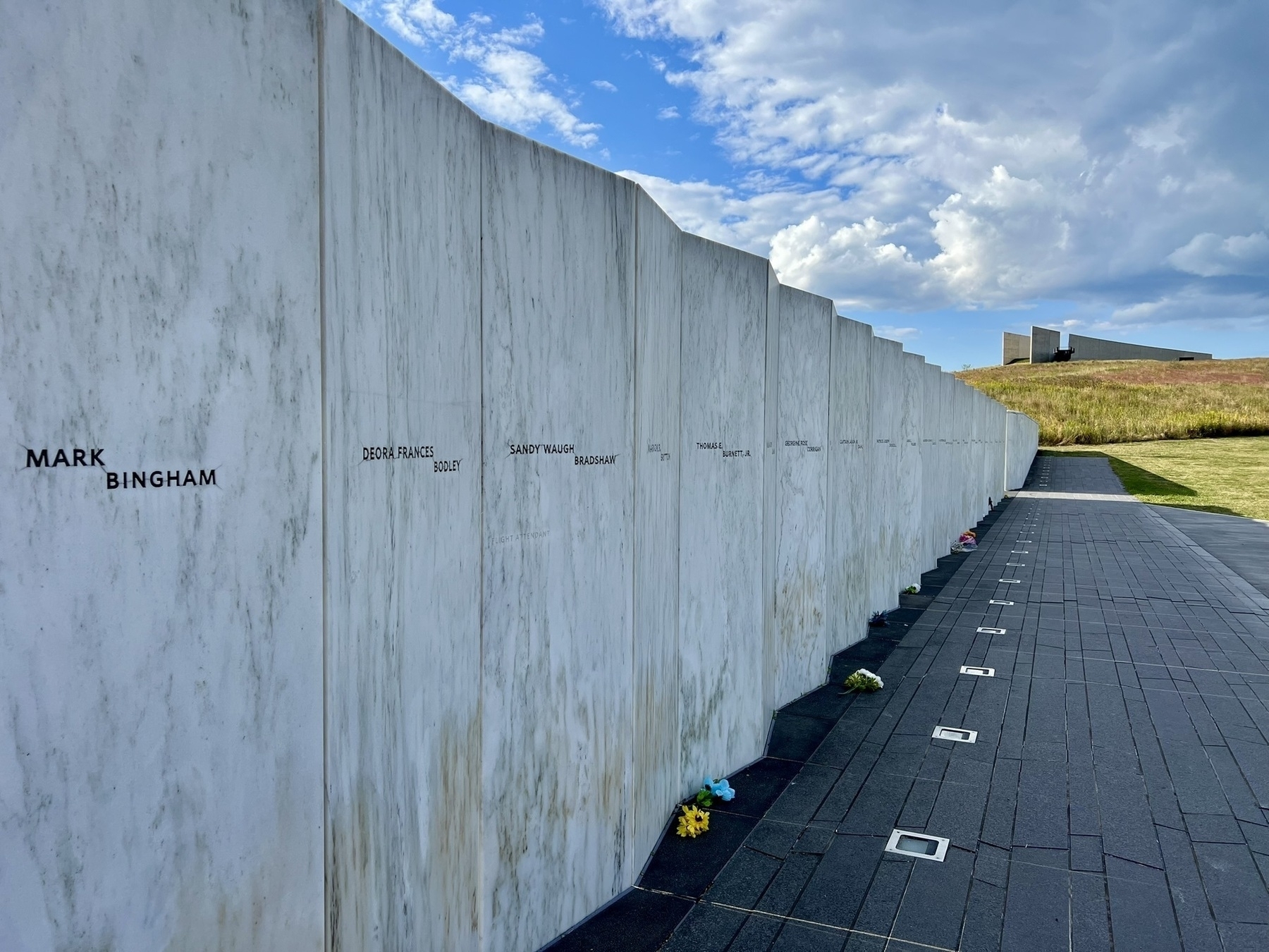 The Wall of Names, looking back up at the visitor center and approach. The gate and boulder are behind you, all lined up with the flight path.