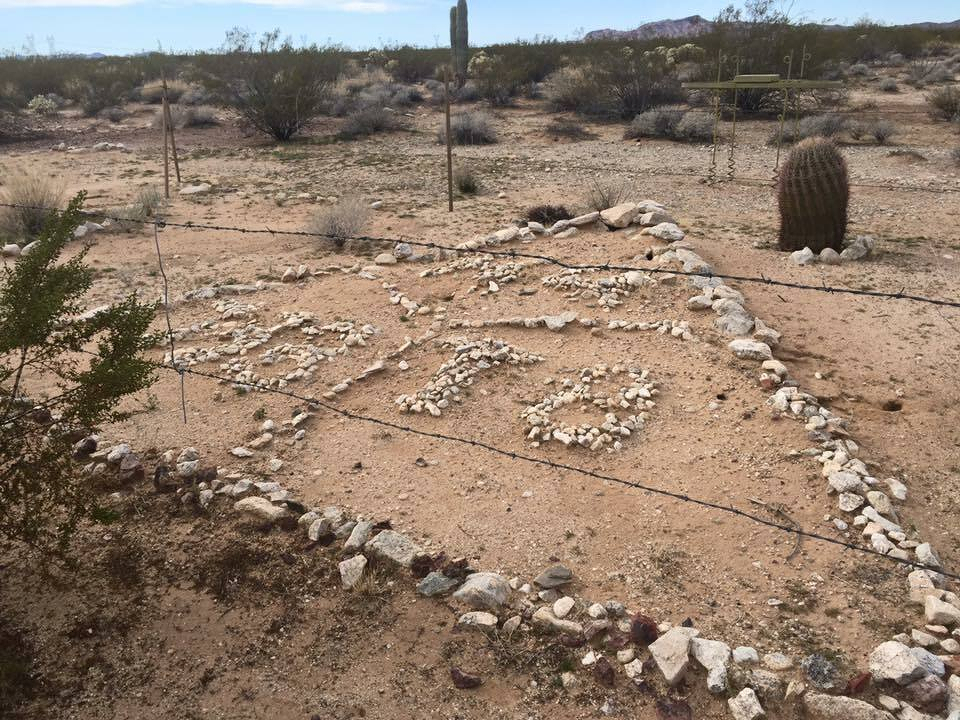 Boundary marker at the US-Mexican border, in the desert near the Dos Lomitas Ranch ruins site.